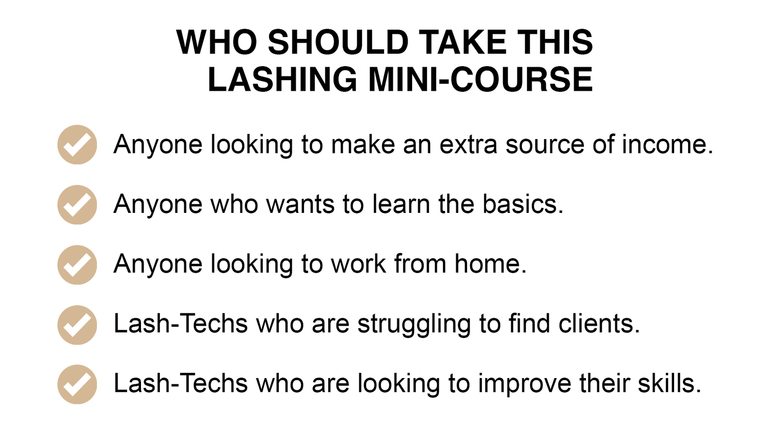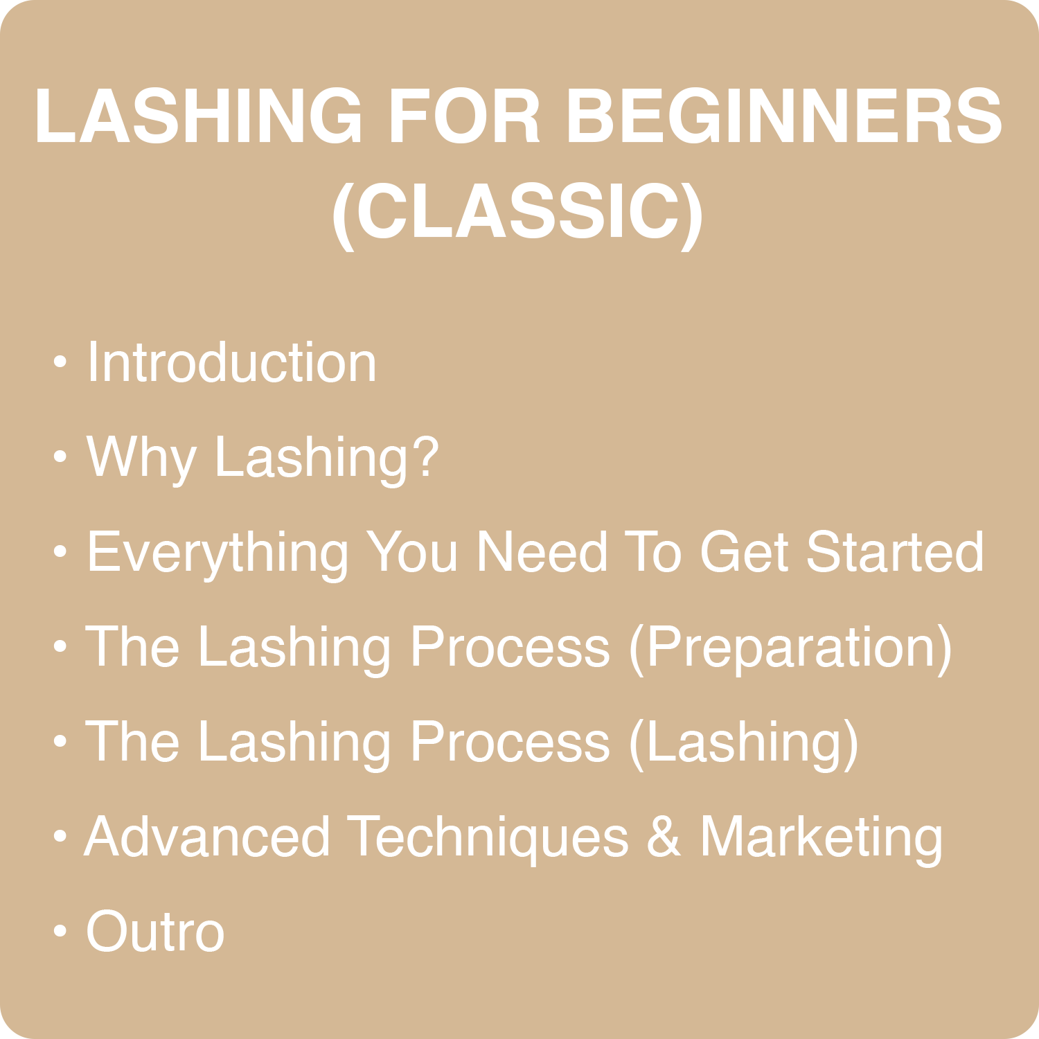 You will gain the knowledge of learning how to lash from beginning to end. I will also teach you my lash secrets that I've learned over the years.